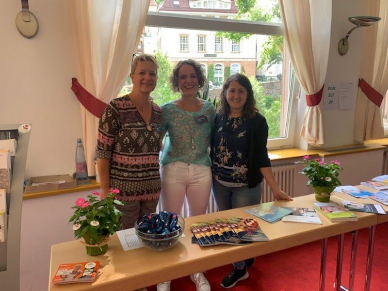 An verschiedenen Ständen konnten sich die Mitarbeitenden zu einer Vielzahl von Themen informieren: Das Hygiene-Team des Quellenhofs stellte aktuelle Konzepte zu Haut-, Hände- und Hitzeschutz vor. Das Team des Betrieblichen Gesundheitsmanagements präsentierte u. a. die internen Angebote rund um die Themen Gesundheit und Vereinbarkeit von Beruf und Familie. Dazu gehörte insbesondere die Vorstellung des pme Familienservice, der vielfältige Maßnahmen im Bereich Lebenslagencoaching, Prävention aber auch Vereinbarkeit bietet – von der Kinderbetreuung bis zur Betreuung und Unterstützung pflegender Angehöriger war alles dabei. Ebenfalls informierte der Betriebsrat unter Karl Agarius über das Betriebliche Eingliederungsmanagement.