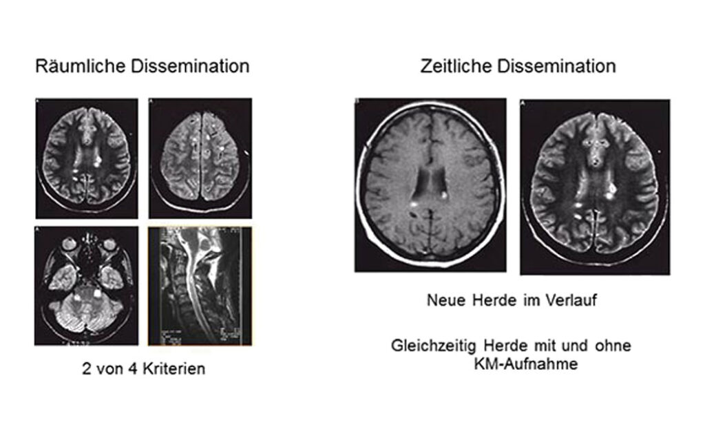 Die MRT zeigt bei einer MS entzündliche Veränderungen („Läsionen“, „Plaques“) an für die Erkrankung typischen Stellen im Gehirn oder Rückenmark. Die Diagnosekriterien („McDonald-Kriterien“) erlauben, die Diagnose oftmals schon nach dem ersten Ereignis zu stellen.