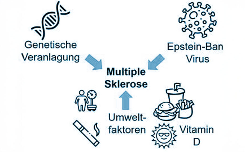 Insgesamt entsteht die MS nach heutigem Kenntnisstand durch ein komplexes Zusammenspiel aus genetischer Veranlagung, Umweltfaktoren, Lebensstil und einer früheren Epstein-Barr-Virus-Infektion als möglichem Auslöser.